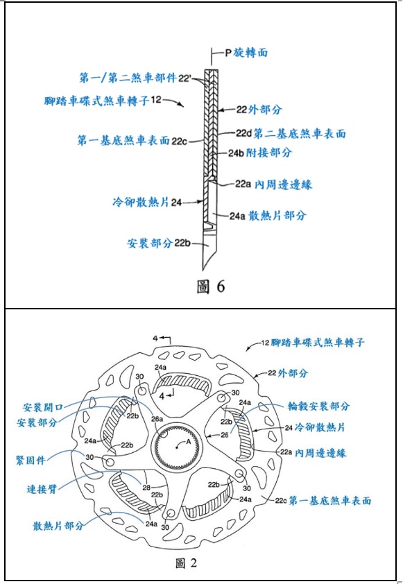 由上可知系爭專利圖式第4、5、6圖所顯示冷卻散熱片之配置方式均係符合「徑向偏置」之意義,而依系爭專利圖式第4、5、6圖所示,冷卻散熱片呈「徑向偏置」時,係包含冷卻散熱片連接於第一或第二煞車表面之至少一者內緣(即第4、5圖),或冷卻散熱片之一部分夾設於第一及第二煞車表面間,而在直徑方向上有所重疊,其餘部分則連接於第一或第二煞車表面之內緣(即第6圖)之實施態樣,而系爭專利請求項1並未有冷卻散熱片不得部分夾置於第一及第二煞車表面間,或不得與第一及第二煞車表面有所重疊之記載。