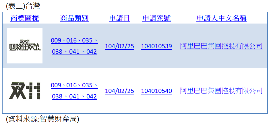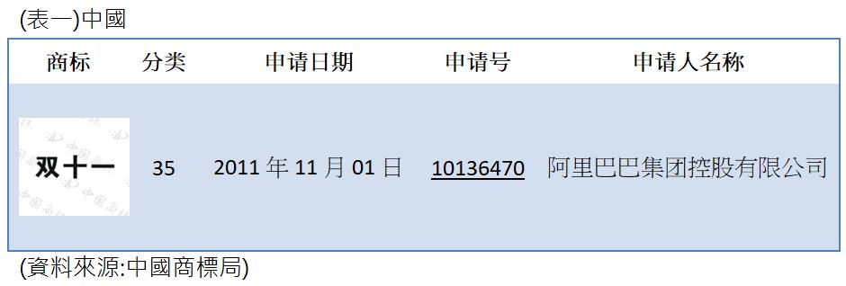 經查中國商標局及我國智慧財產局商標資料庫,阿里巴巴集團控股有限公司為了保護「雙11」商標,除提交中國商標申請,也提交我國商標申請案如下表一、二。中國商標局於2012年12月27日准予註冊公告,但嗣後他人以「雙11」為通用名稱,提出撤銷申請,雙方纏訟多年,直至2021年北京市高級人民法院判決確定,撤銷「雙11」商標註冊並命原處分機關重為處分。