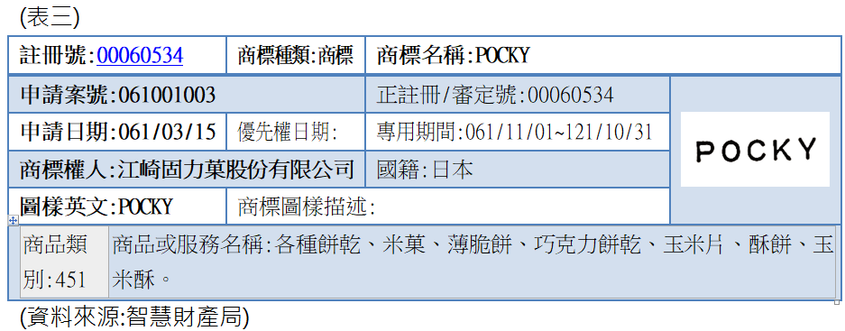 且日本固力菓公司為了更周全地保護商標,陸續申請一系列「POCKY」商標如下表四,除了有主要「POCKY」文字、連「POCKY設計字」、「POCKY產品外包裝」、「Mousse Pocky」都申請保護。