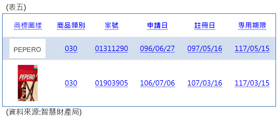 經查智慧財產局商標資料庫,南韓樂天公司「Pepero」商標申請註冊如下表五。