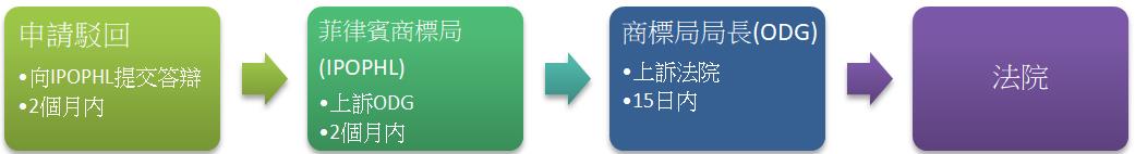 經IPOPHL實體審查後,認為有不予註冊事由者,將通知申請人於2個月提交答辯意見,未能克服審查意見者或未提出答辯意見者,IPOPHL將發出核駁處分。申請人不服IPOPHL決定者,可於2個月內商標局局長(OFFICE OF THE DIRECTOR GENERAL,以下稱ODG)提出複審。若對於ODG之決定不服者,可於15日向法院提起訴訟。