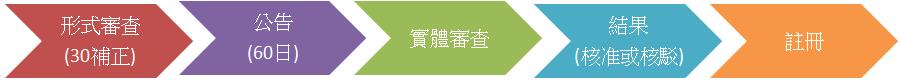 IPD收到申請後進行程序審查,不符規定者,官方將通之30日補正;符合規定者,將進入的商標公告期,任何人對於該商標有意見者,可於60日提出商標異議,若無人異議者。官方將進入商標實質審查期間,未有不予註冊事由者,將准予商標註冊,發給商標註冊證書。