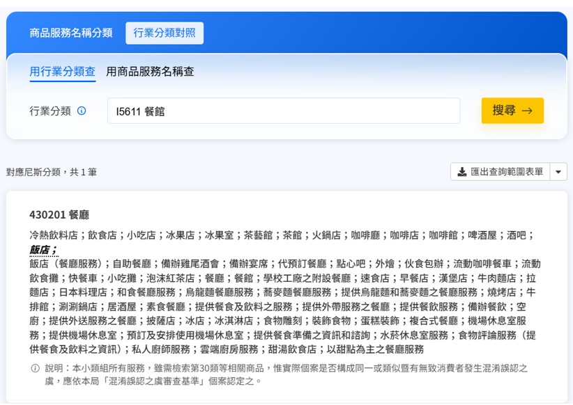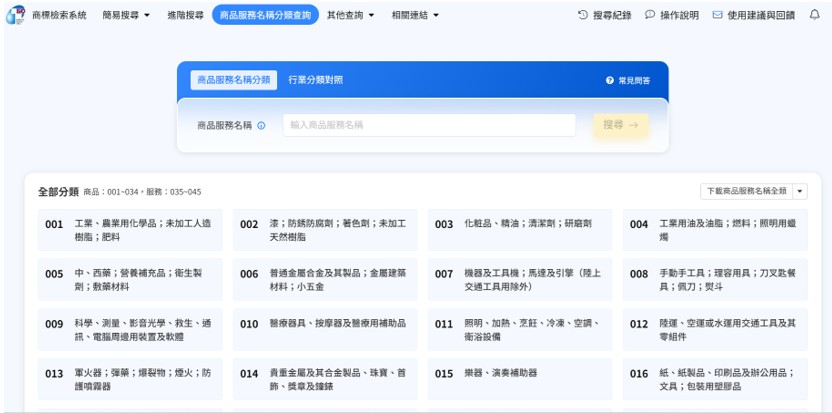 一般申請人,對於商標45個分類商品及服務項目並不熟悉,因此,官方為方便一般申請人,提供另一種確認商品及服務名稱方法,即透過「行業分類」,使用行業類別與商品/服務名稱分類組群對照查詢,挑選出對應的分類及官方接受的商品及服務名稱。