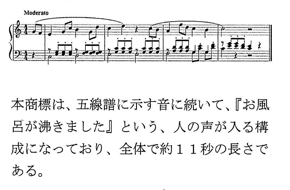 商標登録されたのは、住宅機器メーカー「ノーリツ」(神戸市中央区)製の給湯器のメロディーと声。1997年以降の製品から、浴槽の湯張りが完了した時にリモコンから流れるようになった。ドイツ人作曲家のピアノ曲「人形の夢と目覚め」の第2部「夢を見ているところ」の「ソファミ~ソドシ~ソレド~ミ~」というメロディーを奏でた後、「お風呂が沸きました」と告げる。