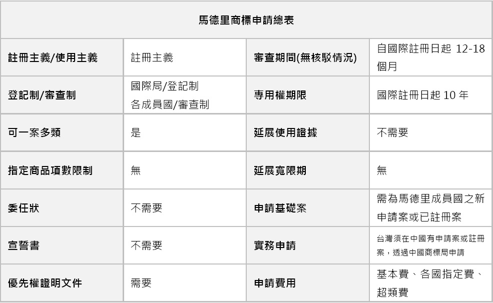 2.馬德里商標於各指定締約國獲准,其受到的保護如同單一申請案取得註冊一樣。